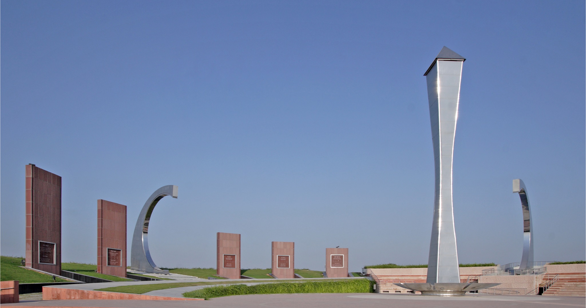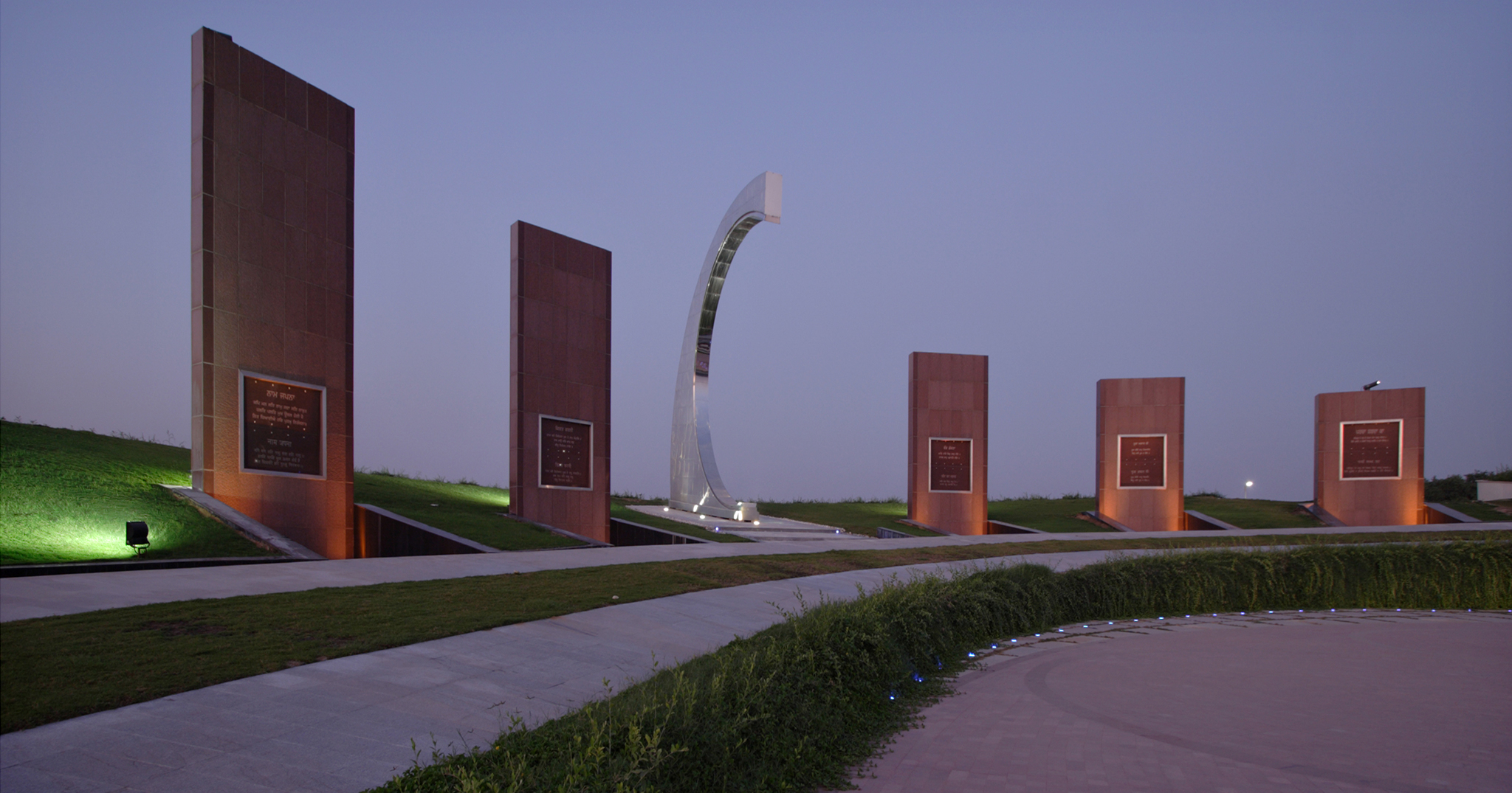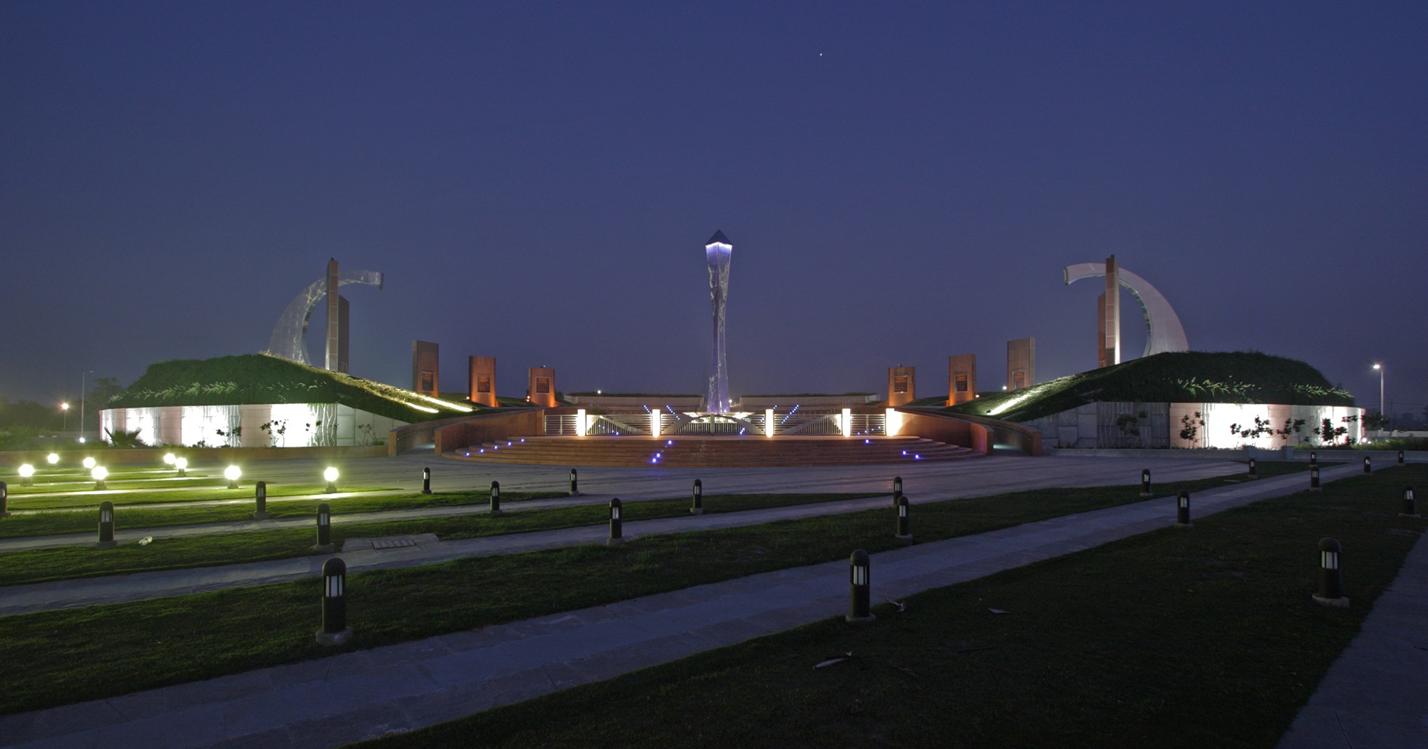 The project is primarily composed of different landscape and architectural elements of varied textures and reflectivity. To contain the space, gentle curves are provided through earth mounds. These mounds create a tranquil backdrop to the memorial and also cups the central pylon.