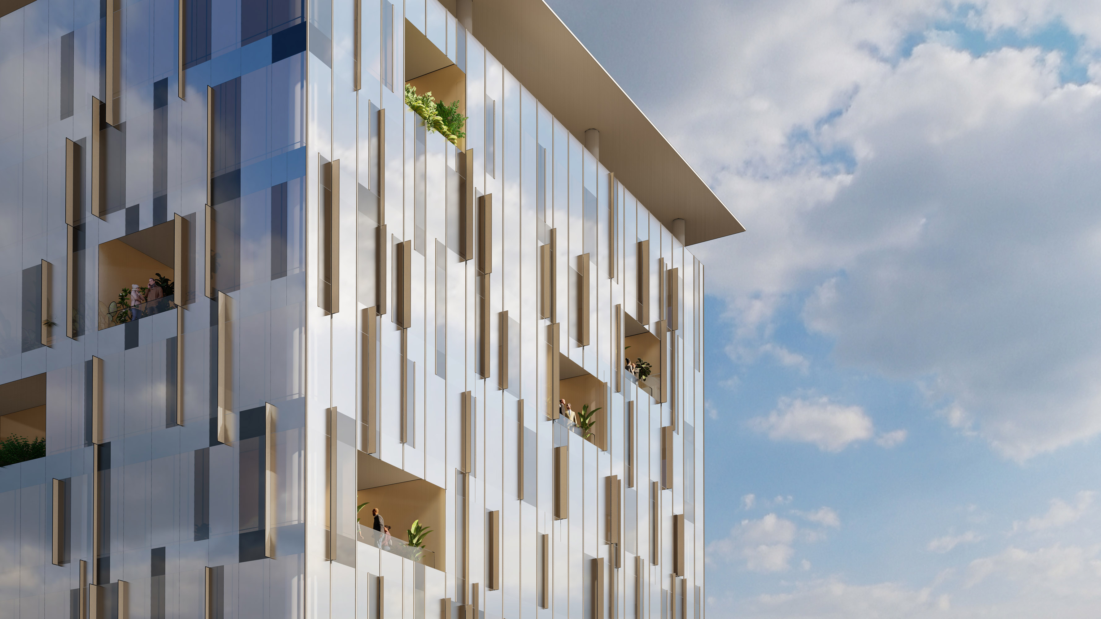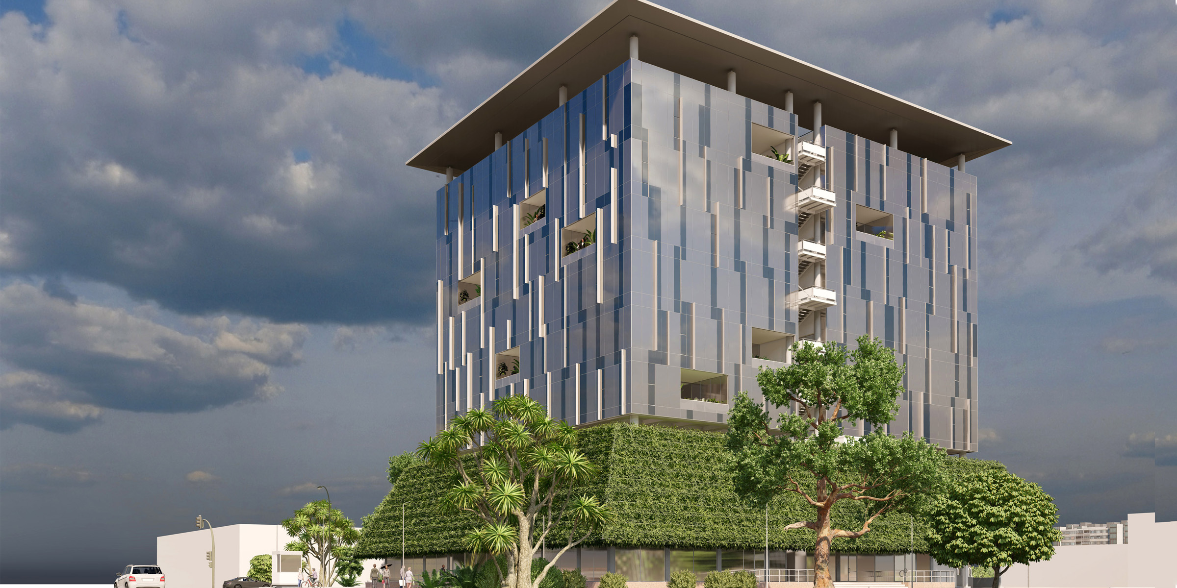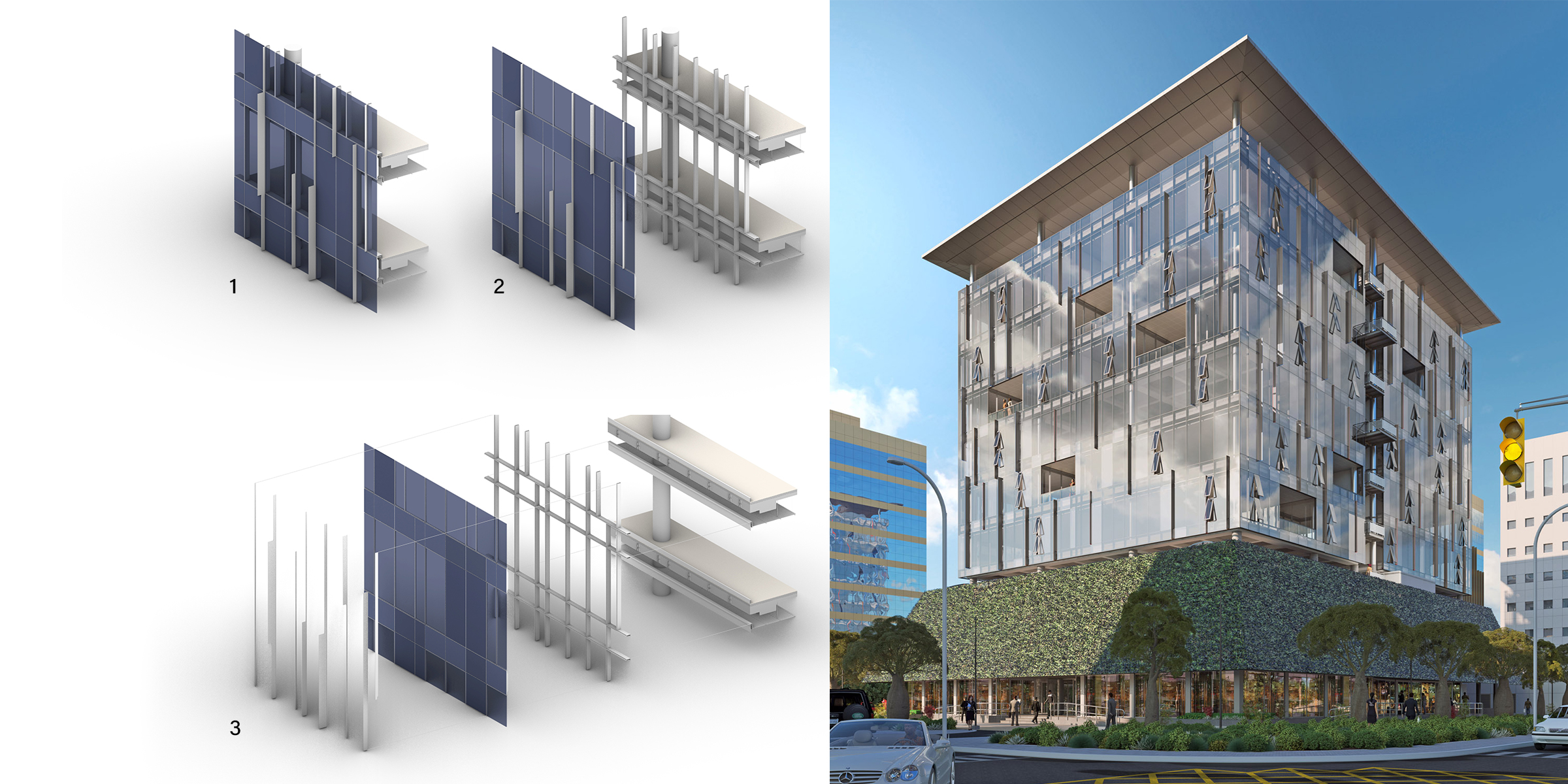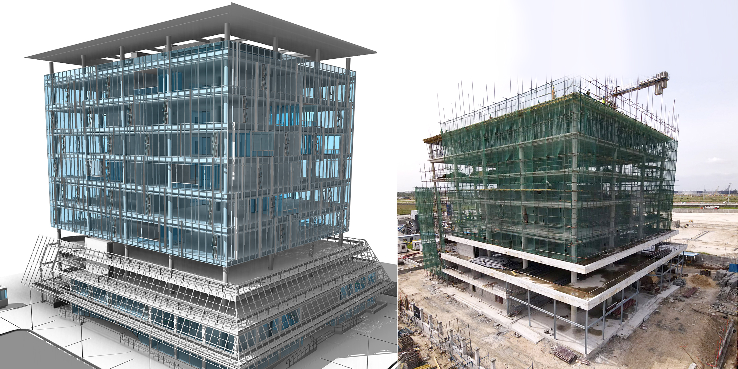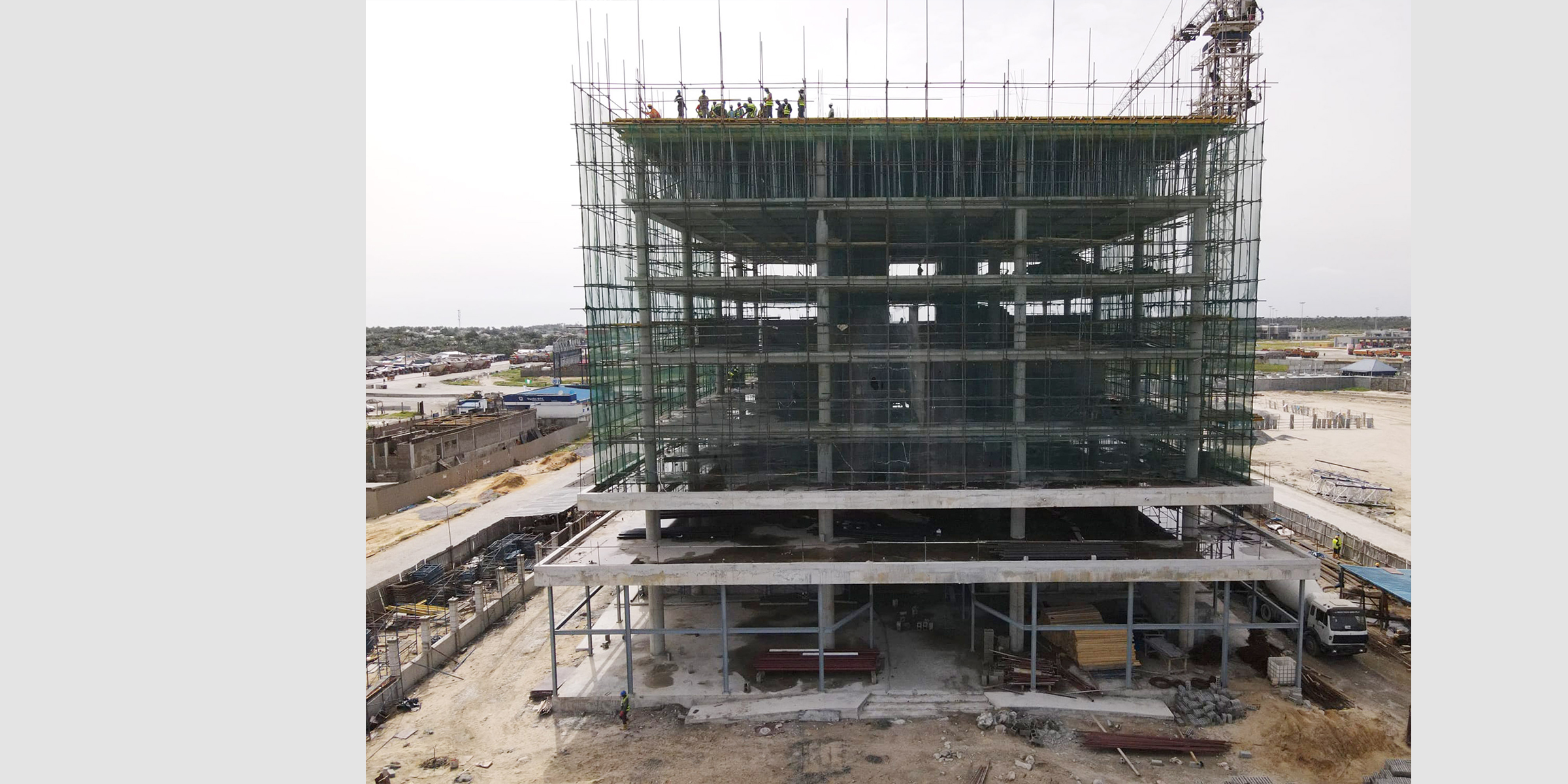 Envisaged as a powerful symbol for the Tolaram Group who have developed the largest deep-sea portand the accompanying SEZ on the African peninsula in Lagos, Nigeria. The form has evolved from thevision of a stack of ship containers which eventually express themselves as glass surfaces. The resultingglass volume has masses removed to create “Breakout Spaces” which break the bounding boxpunctuating it with greenery. Vertical metal fins of varying colors harken back to the vertical corrugationon container walls and the verticals on ship masts further accentuating randomness within the well-defined volume. The glass volume, floats like a ship over an expansive green wall that visually shields themultilevel car parking.