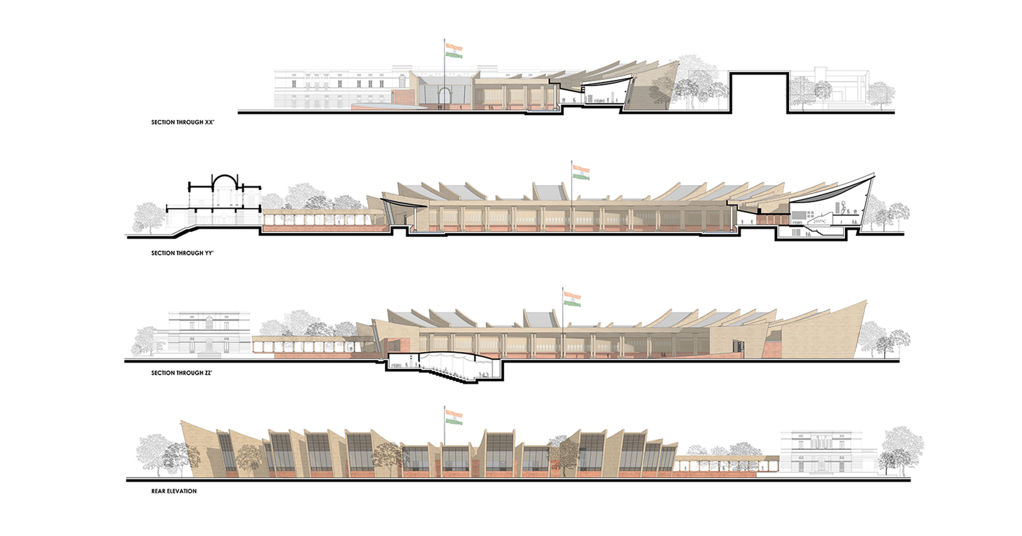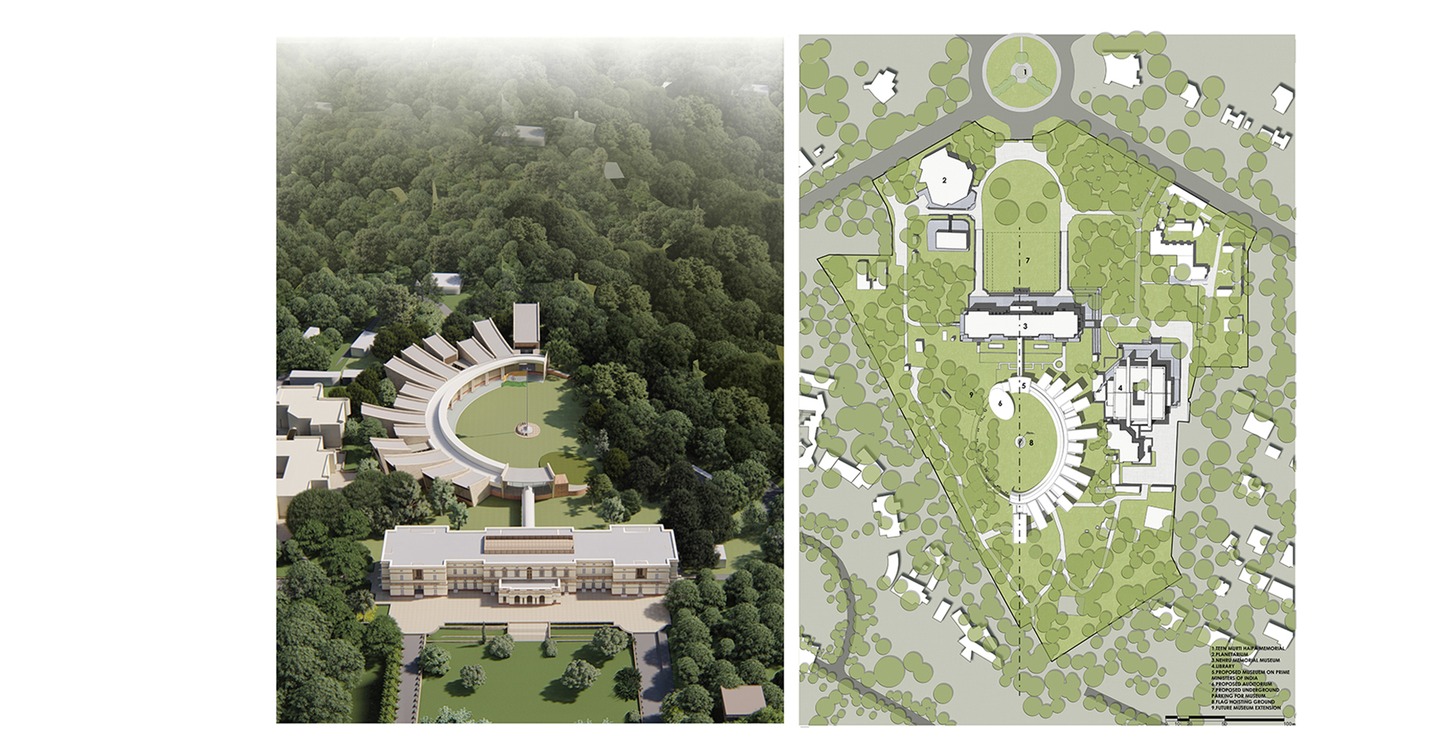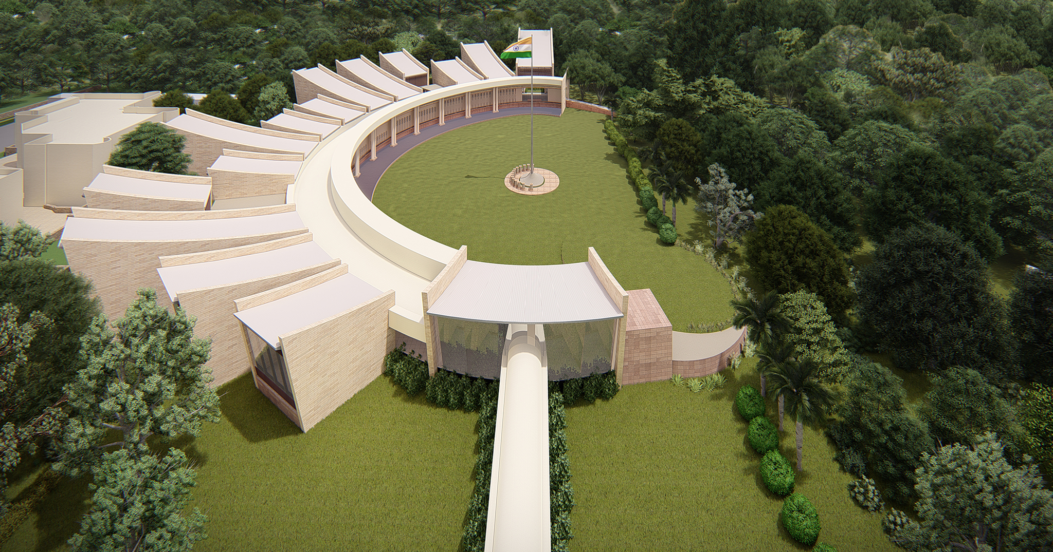 The North and South Lawns of Teen Murti Bhavan multiply the grandeur of the place. The proposed building hence runs around the South Lawns in a curve to accommodate the vast green within as well as affording the opportunity to extend the museum in the years and decades to come.