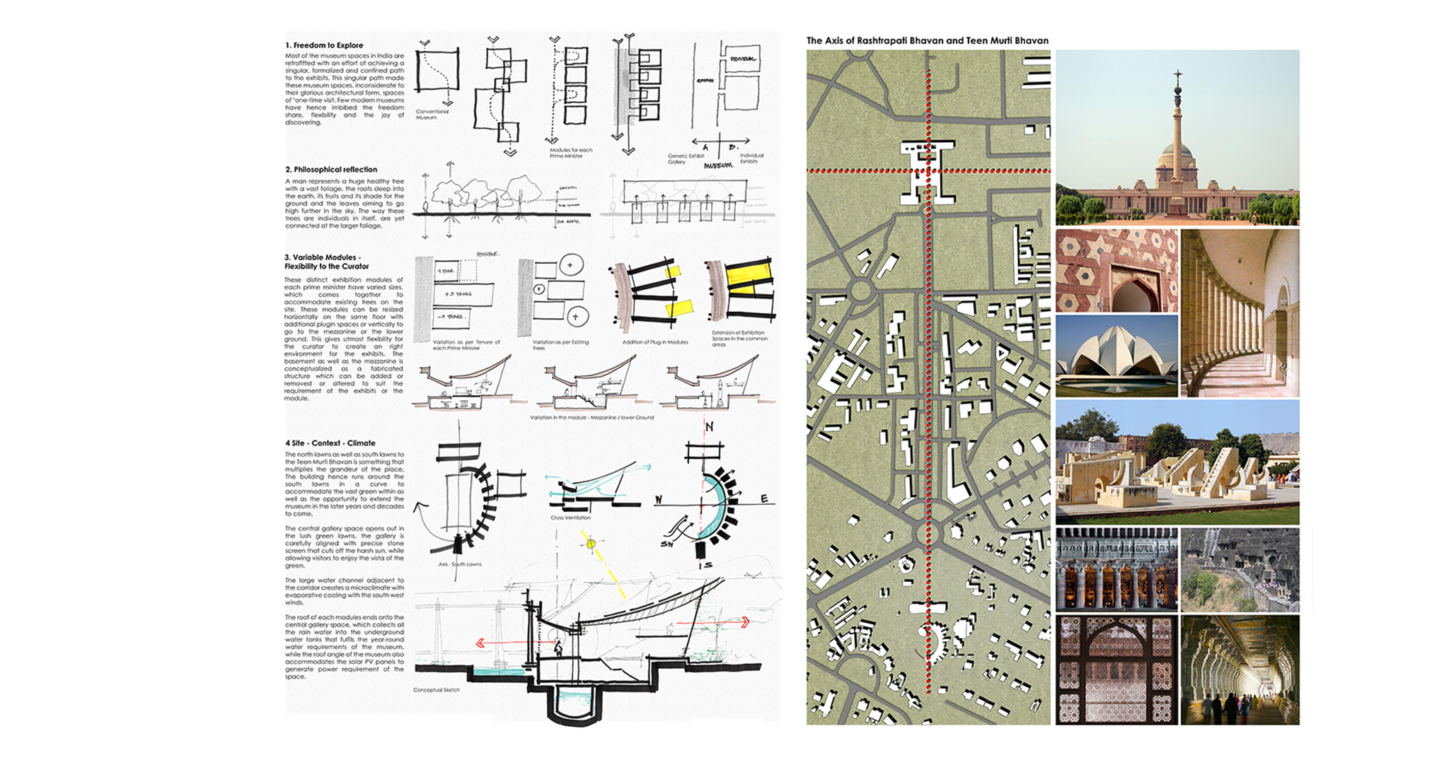 These distinct exhibition modules of each prime minister have varied sizes, which come together to accommodate existing trees at site. These modules can be resized horizontally with additional plugin spaces or vertically with a mezzanine or lower ground. This gives utmost flexibility to the curator to create a conducive environment for the exhibits. The basement and mezzanine is conceptualized as a fabricated structure to be added or altered as desired.