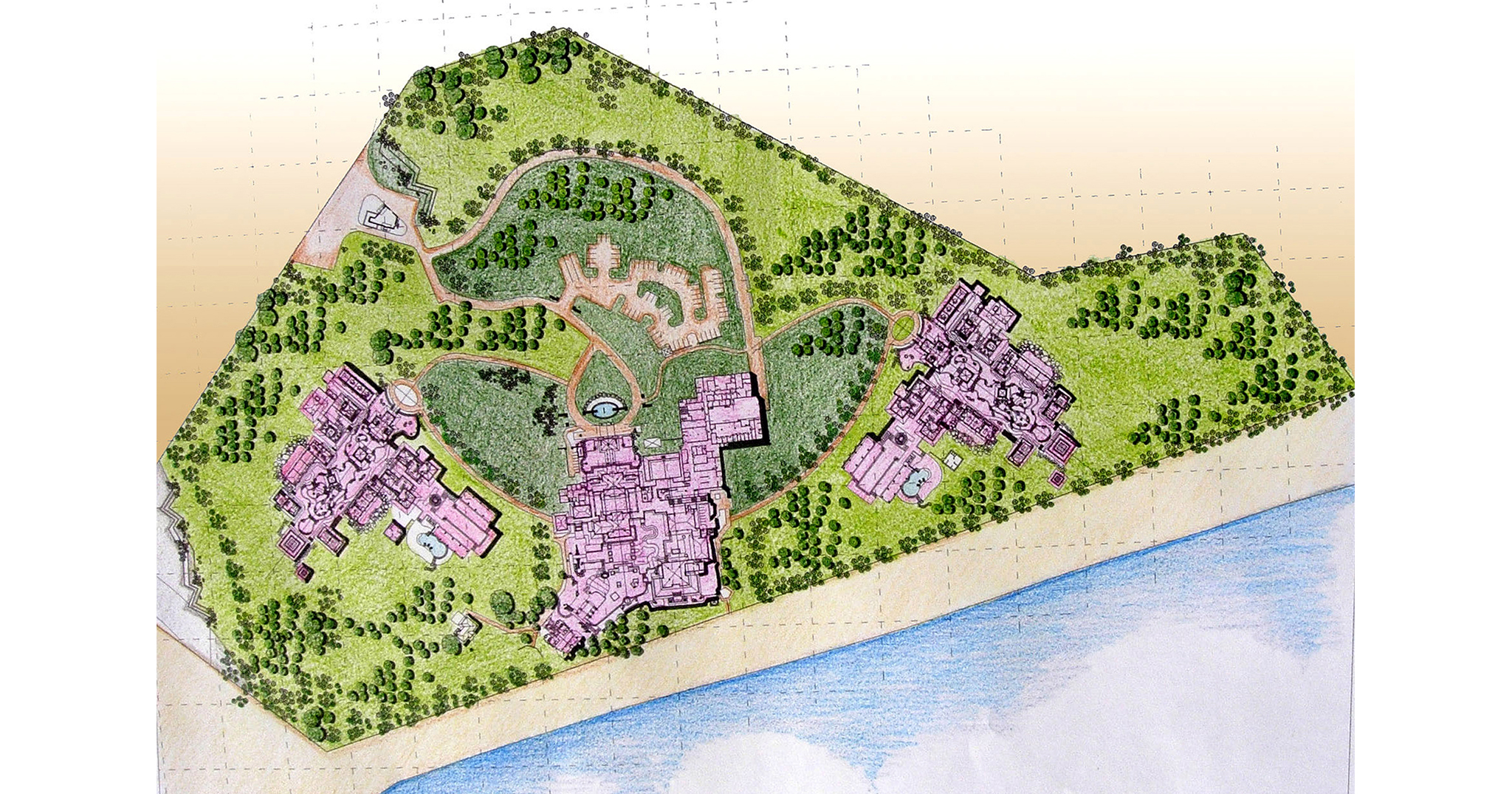 Architectural interpretation of the pearl into a hotel building was achieved with the lower shell of the Clam-Pair housing all the public functions like Banqueting, Auditoriums, Meeting Halls, Conferences, Exhibitions etc. with their related services.