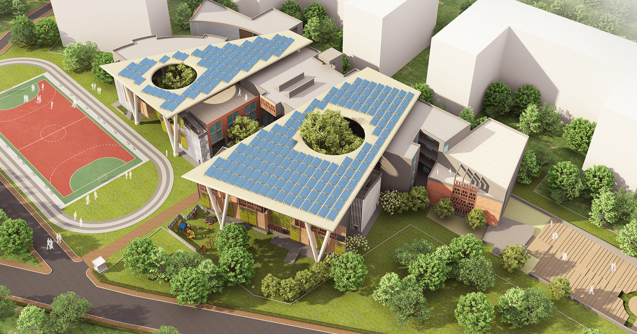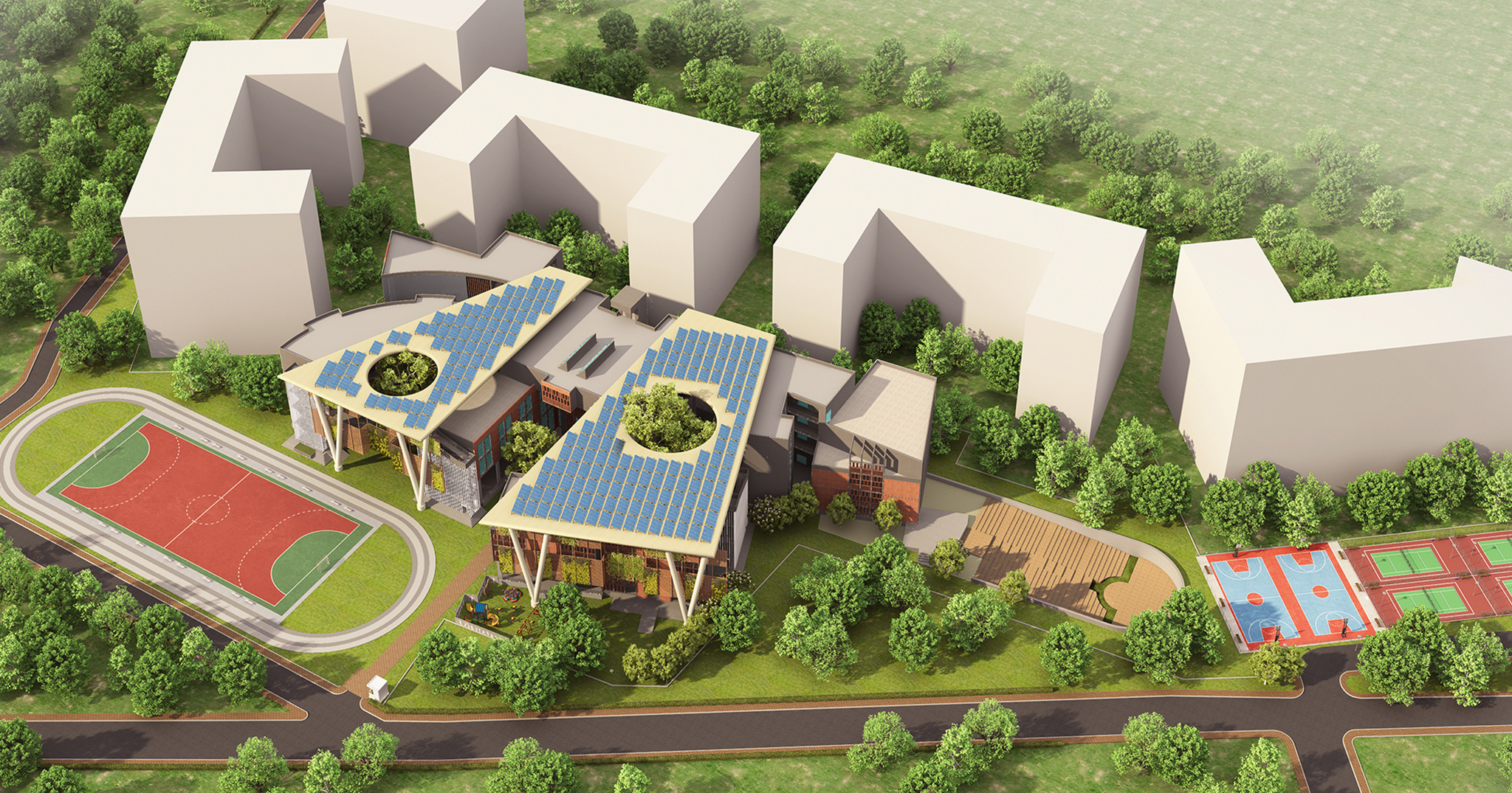 The large oversized canopy ties all the courts into distinct identities apart from housing the required solar panels for our energy needs. The roof tops of the buildings have been used for semi outdoor activities.