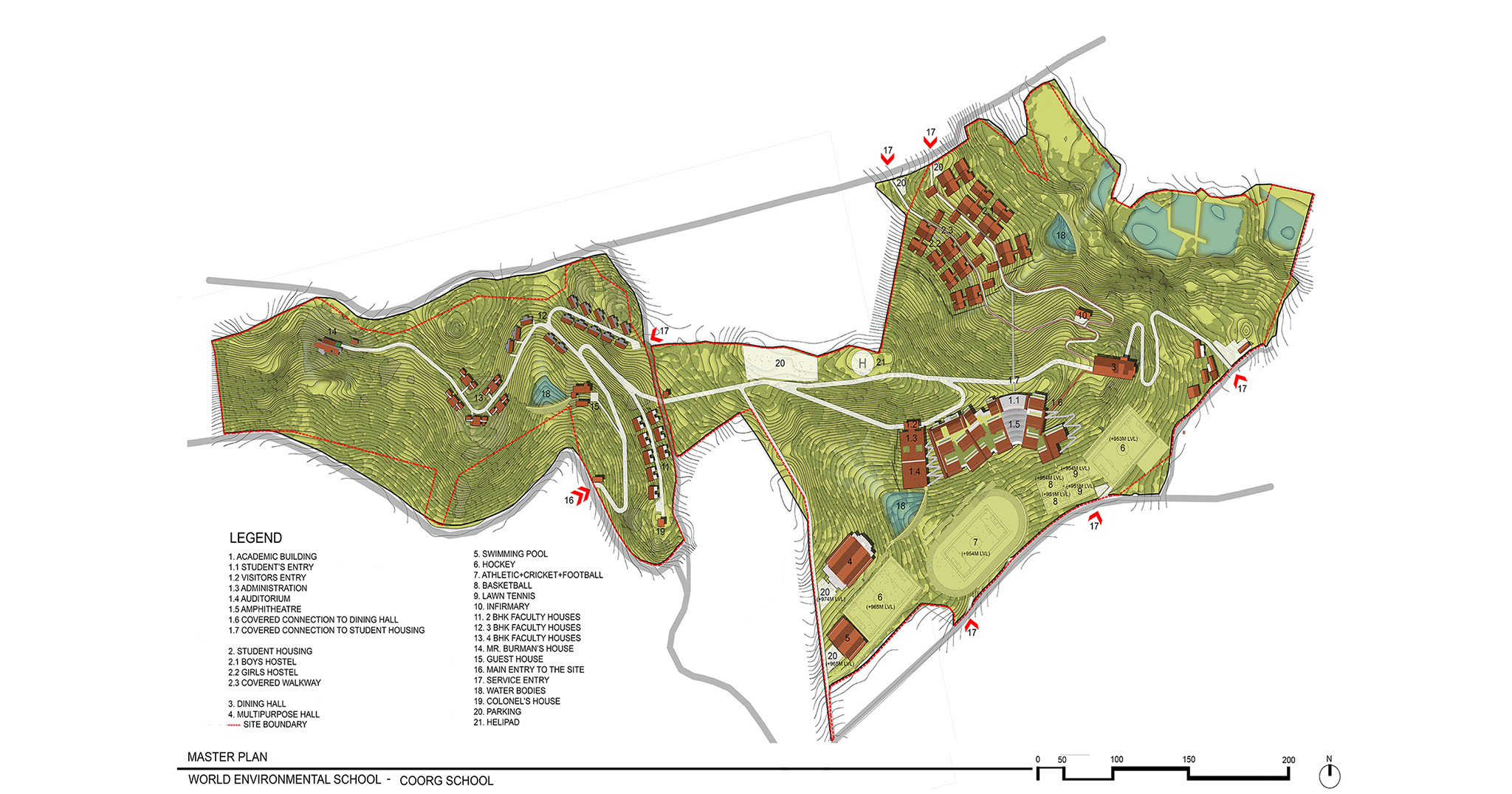 Treading lightly on the grounds by minimizing the building footprint and ensuring minimum cut and fill, thus optimizing the natural vegetation are the main attributes of the Master Plan.